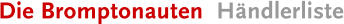Diese Liste der deutschen Brompton-Händler basiert auf Informationen des Importeurs Voss-Spezialrad vom Herbst 2002. Wir wissen nicht, ob alle Händler Ersatzteile oder wenigsten Reifen vorrätig halten. Ein vorheriger Anruf ist sicher zu empfehlen.